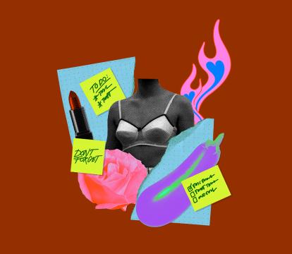 Collage with torso in bra, lipstick, pink rose, eggplant, flames, and sticky notes with reminders.