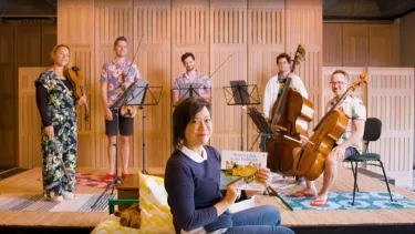 Learn about the string family and how musical techniques can be used to create mood, character and setting with Karen Pang and musicians from the Australian Chamber Orchestra on the set of There's a Sea in My Bedroom.
