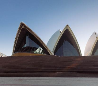 The Monumental Steps lead from the Forecourt to the Podium Level below the Sydney Opera House sails. Badu Gili (Lighting of the Sails) is best viewed from the upper level (Podium).