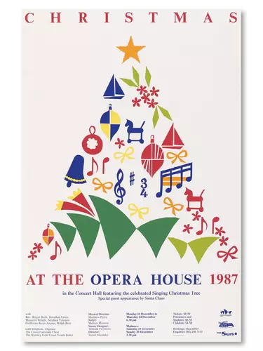 This colourful collage of bows, tinsel, holly and toys shaped into a Christmas tree. Joyous and bright, this family affair in the Concert Hall was a yearly event filled with carols, and of course, Santa.