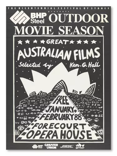 The Monumental Steps is filled with onlooking eyes as a spool of film reel leads guides our view up to the sails. This charming design speaks to much of the Australiana aesthetics of the time and leaves the viewer curious for more. Though no films have been named on the poster, the season’s curator was Kenneth George Hall AO OBE, one of Australia’s greatest film producers and the first Australian to win an Academy Award.