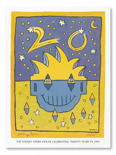 A face in the reflection in Sydney Harbour. Twenty years on this poster shows the Sydney Opera House has found its identity. The sails of the House have been playfully made into a face with a big Harbour Bridge grin.