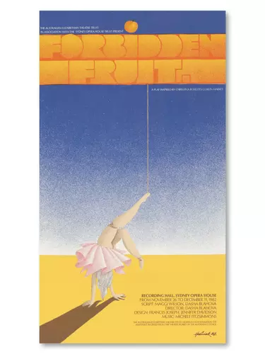 Presented by the Elizabethan Theatre Trust, this performance produced by the Aurore Puppet Theatre was innovative for its time. Based on Goblin Market, a poem by Christina Rossetti, this play took us through a surreal world of puppetry. In this poster we see a figure tethered to the fate of the forbidden fruit in a sparse landscape, adding to dramatisation and suspense.