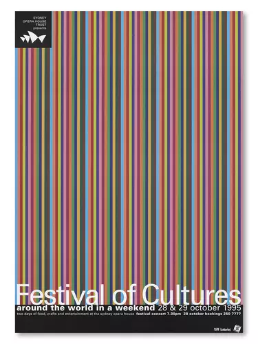 Bold contrasts and the scattering of multicolour type over the sails is used to represent the diversity of the Folkloric Festival. Running through the 70s and 80s, this festival celebrated traditional cultures from across the world on the Sydney Opera House Forecourt.
